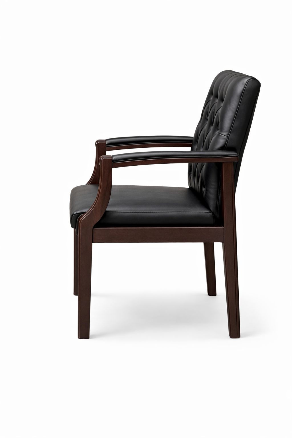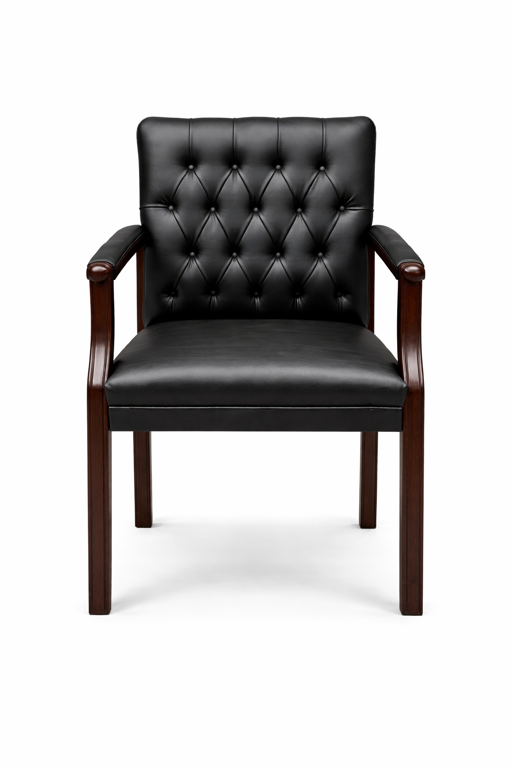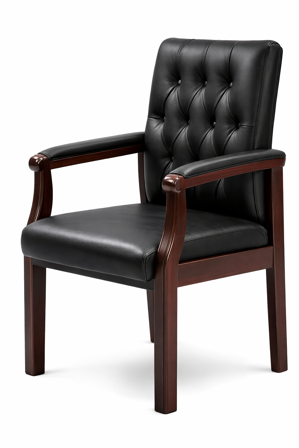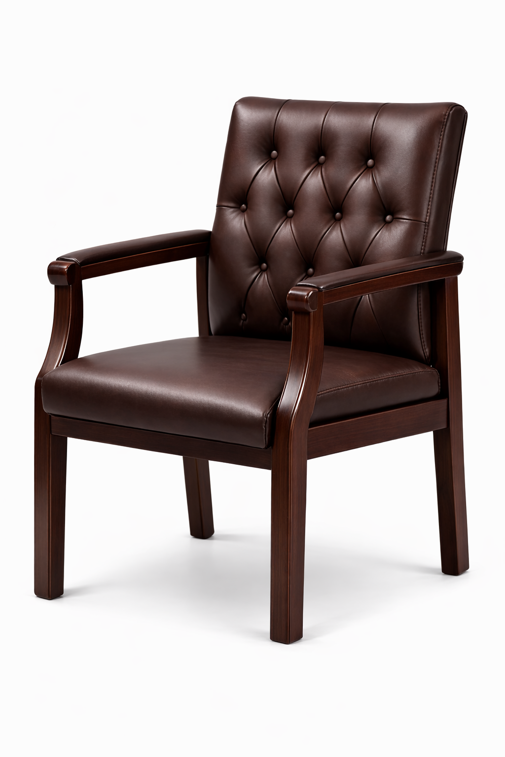 Add sophistication and comfort to your workspace with this luxury brown leather visitor chair with wooden arms. Crafted with a strong solid wood frame and premium leather upholstery, this chair provides both durability and timeless style. The elegant tufted backrest design enhances the executive appearance while offering excellent back support.