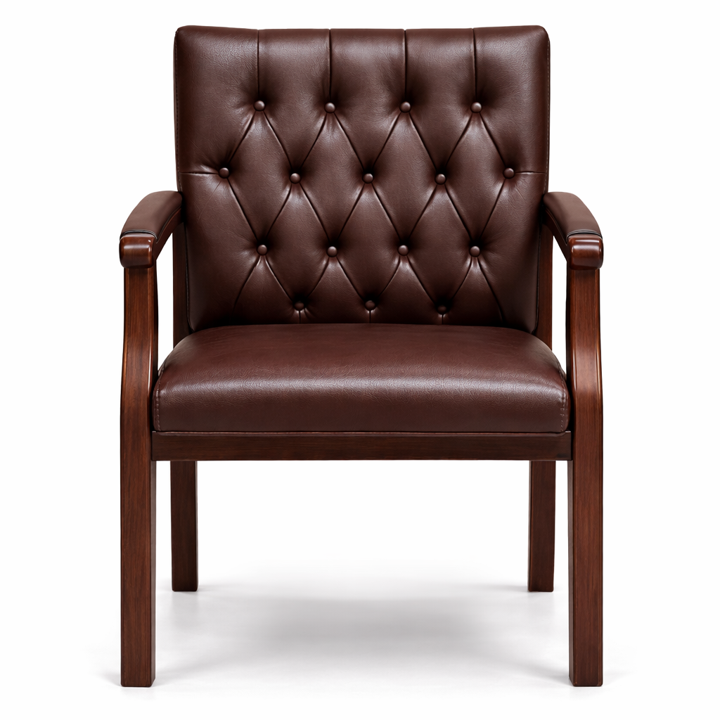 Upgrade your office or meeting space with this luxury brown leather visitor chair featuring a strong wooden frame and elegant tufted backrest. Designed for comfort and style, this executive guest chair is perfect for offices, reception areas, meeting rooms, and home workspaces.